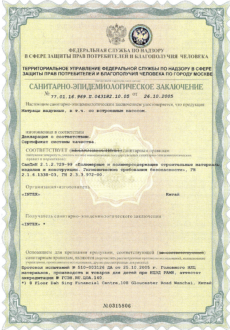 Сертификат: Матрацы надувные, в том числе со встроенным насосом (Сторона 1) (Сторона 2)
