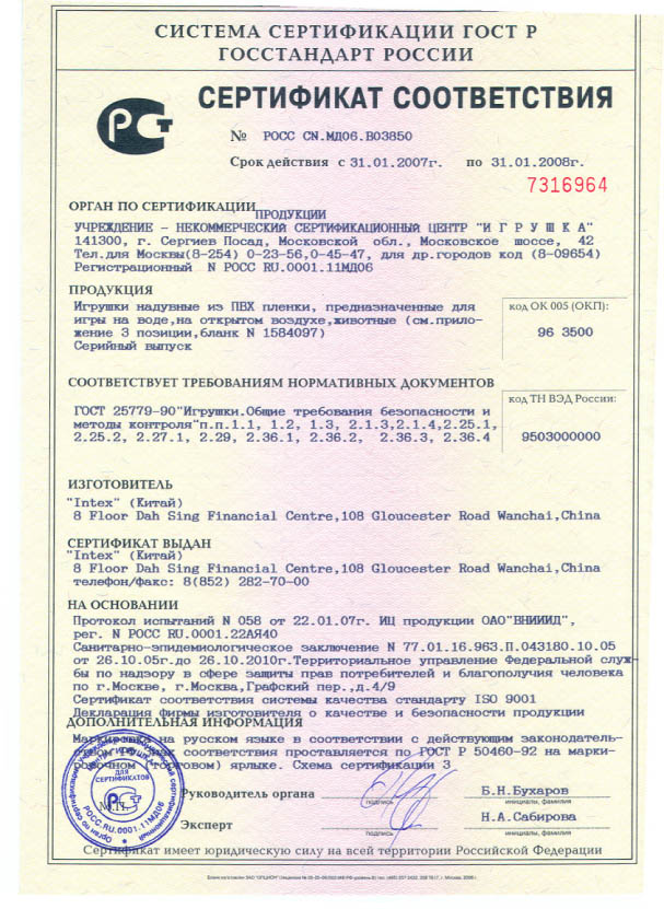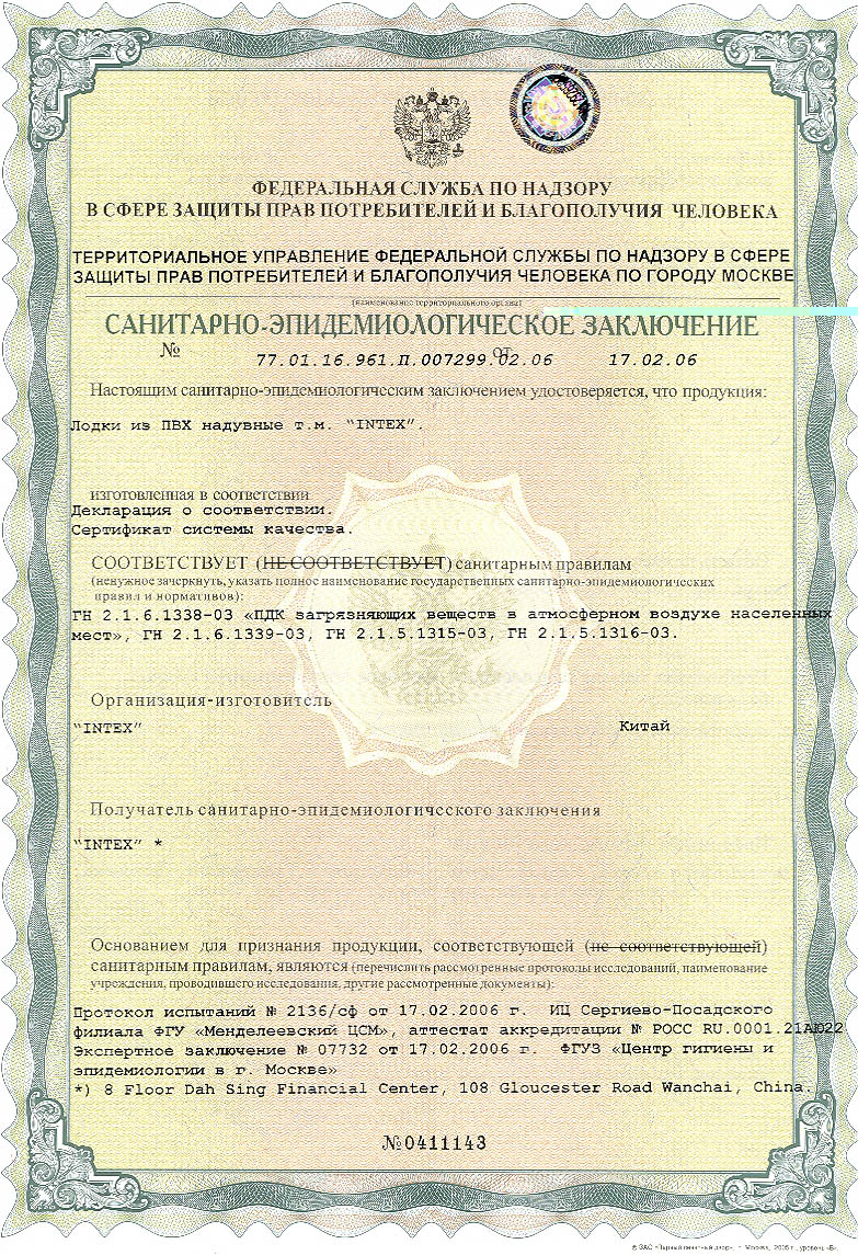 Сертификат: Лодки из ПФХ INTEX™ (Сторона 1) (Сторона 2)
