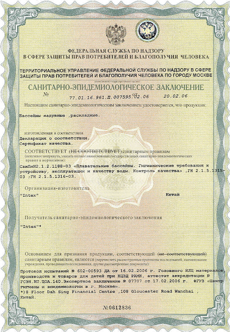 Сертификат: Надувные бассейны, раскладные (Сторона 1) (Сторона 2)