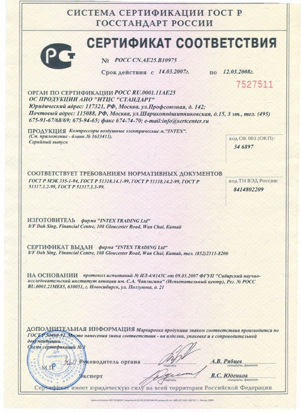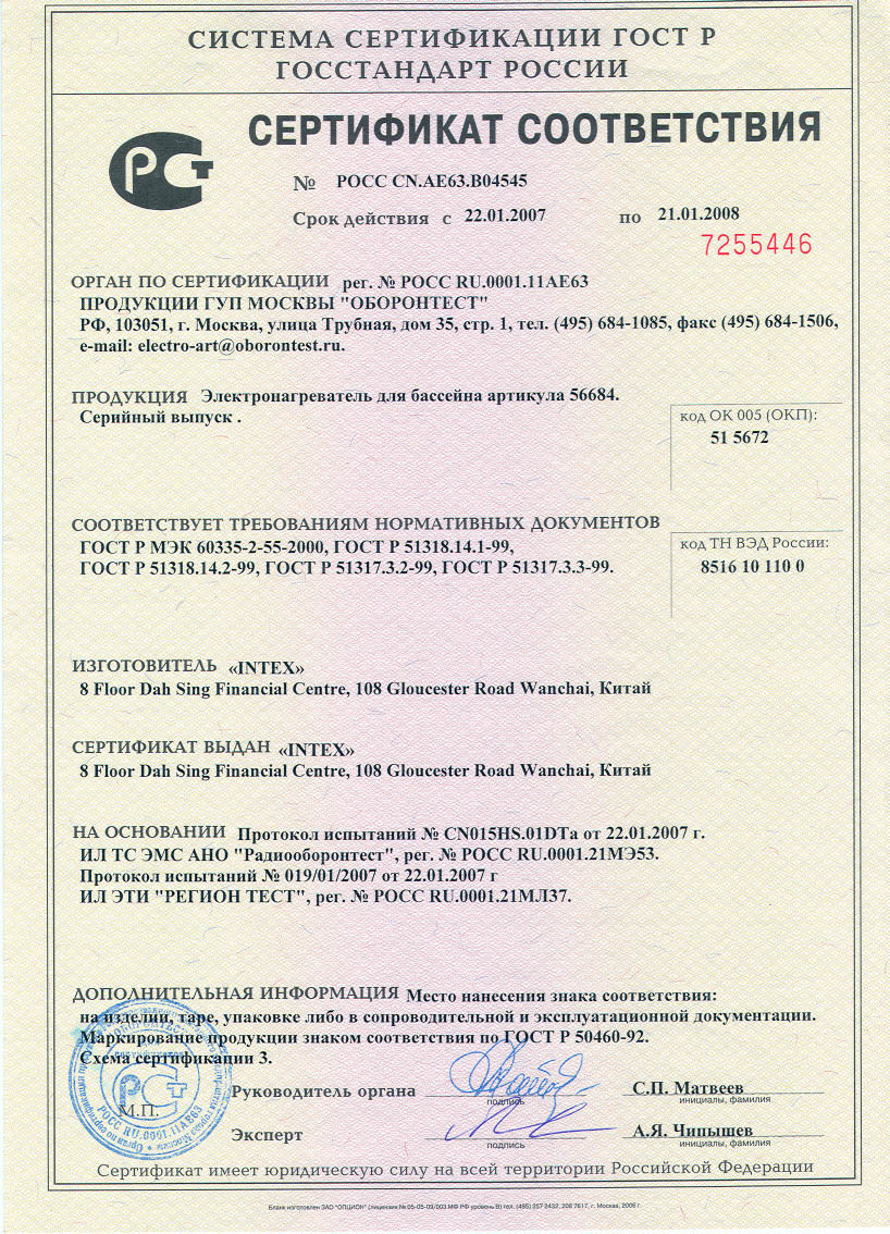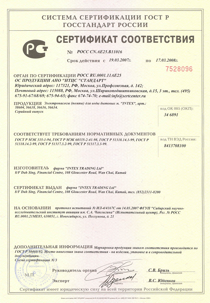 Сертификат: Электронасосы (помпы) для воды бытовые марка INTEX, арт.: 58604, 56638, 56636, 56634