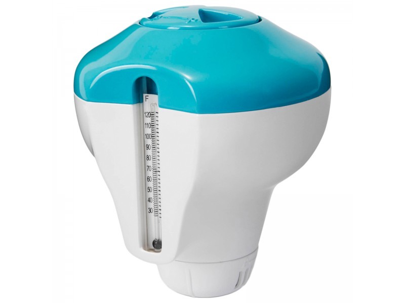 Дозатор плавающий с градусником Intex 29043 подходит для бассейнов диаметром до 305 см. Вмещает 2,5 см. таблетки хлора, брома. Изготовлен из стойкого к ультрафиолетовому излучению пластика.